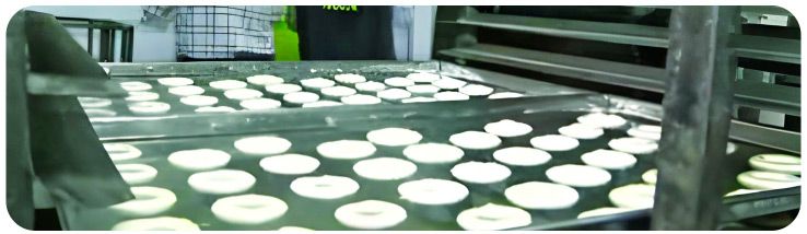 Polvilho, ovos, leite, gordura e nada de fermento. A máquina mexe a massa até dar o ponto. Os grandes tabuleiros são desenhados com rosquinhas alvas, que ganham volume e crocância após 15 minutinhos, em média, no forno. Aquela receitinha tradicional é fabricada hoje em larga escala. Um processo industrial, mas que ainda preserva características caseiras.